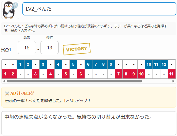 連撃・逆転・自滅などを解析しRPG風のバトルログを自動生成。勝利内容に応じたレベルアップ報酬メッセージで次戦への意欲を高める。10パターンの診断シナリオでドラマチックな振り返りが可能。ジュニア選手が客観的な試合結果を楽しく受け入れられるよう設計。